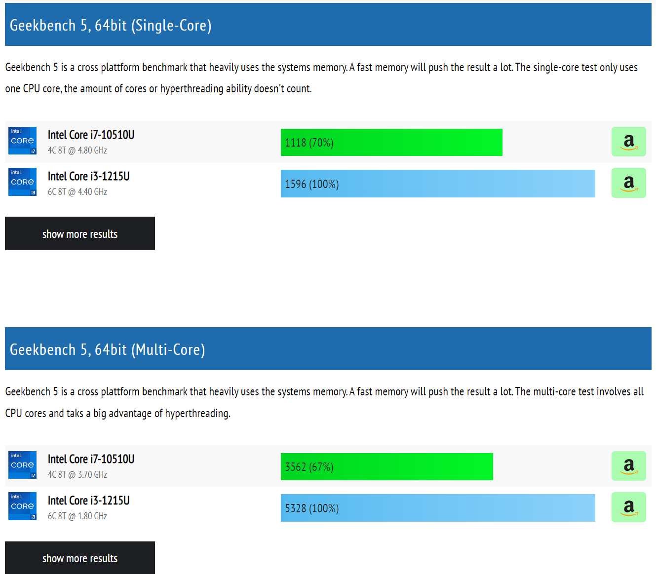 심지어 10세대 동일 시리즈 CPU인 10510U와 비교한 데이터가 있다. 아래를 보면 10세대 i7과 12세대 i3의 비교이다. 사실 12세대부터 CPU에 조금 많은 변화가 일어났다. 특히 E와 P로 나누어진 코어로 전력소비를 줄이고 적절히 구동되어 성능을 발휘하도록 말이다. 아래는 Intel 10세대 i7노트북과 12세대 i3 노트북 프로세서의 비교이다.