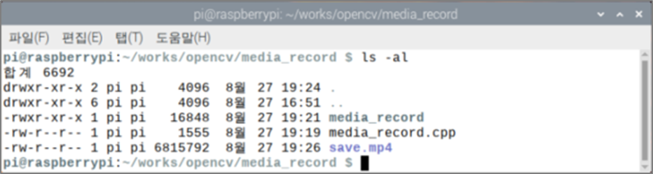그리고 이미지 출력 윈도우를 클릭하고 q키를 눌러서 중단한 다음 디렉터리 내의 파일을 확인해보자. 그러면 소스코드에 입력된 save.mp4라는 파일이 생성된 것을 확인할 수 있다.