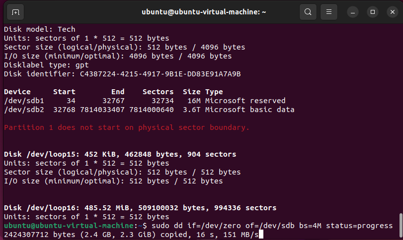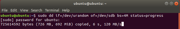 | # sudo time dd if=/dev/urandom of=/dev/sdb bs=4M status=progress |