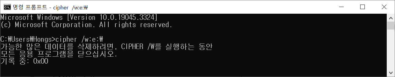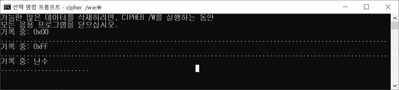 리눅스에서 전체 삭제를 한 디스크로 시험을 해봤다. 장치관리자에서 하드디스크를 잡아주고나니 E:로 설정되었다. 그리고 CMD를 이용해서 아래와 같이 싸이퍼를 실행하였다. 시간이 지남에 따라서 아래에 .이 표시된다. 이건또 얼마나 걸리려나... 덮어쓰기나 이런것들은 시간이 너무 오래걸린다.