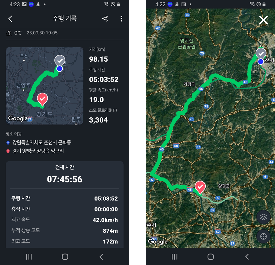 전체 주행시간과 거리는 아래와 그림과 같다. 사실 양평에서 경의선을 탈수 있을 거라 생각하고 천천히 갔는데, 가져간 보조배터리는 모두 바닥났고, 전조등 배터리만 하나, 핸드폰 밴터리도 중간 밖에 없어, 여주까지 30km를 더 가기가 다소 부담스러워서 여기서 종료하기로 했다.