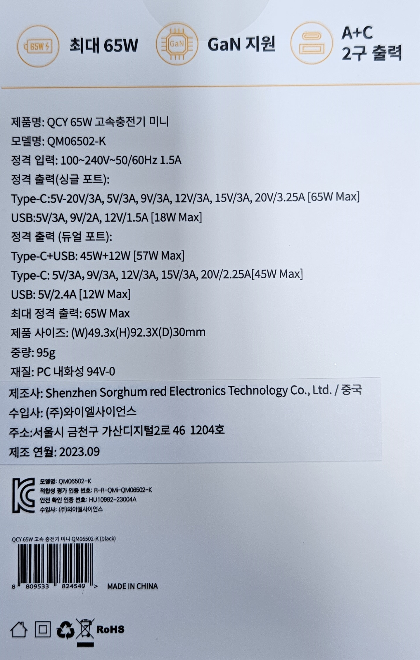 박스에 표시된 스펙은 다음과 같다. 구매하실 독자께서는 확인하고 구매하시면 되겠다. 물품 수입 및 판매에 따른 최소 인증인 KC인증도 받아놨으니 그나마 안심하고 사용할 수 있겠다.