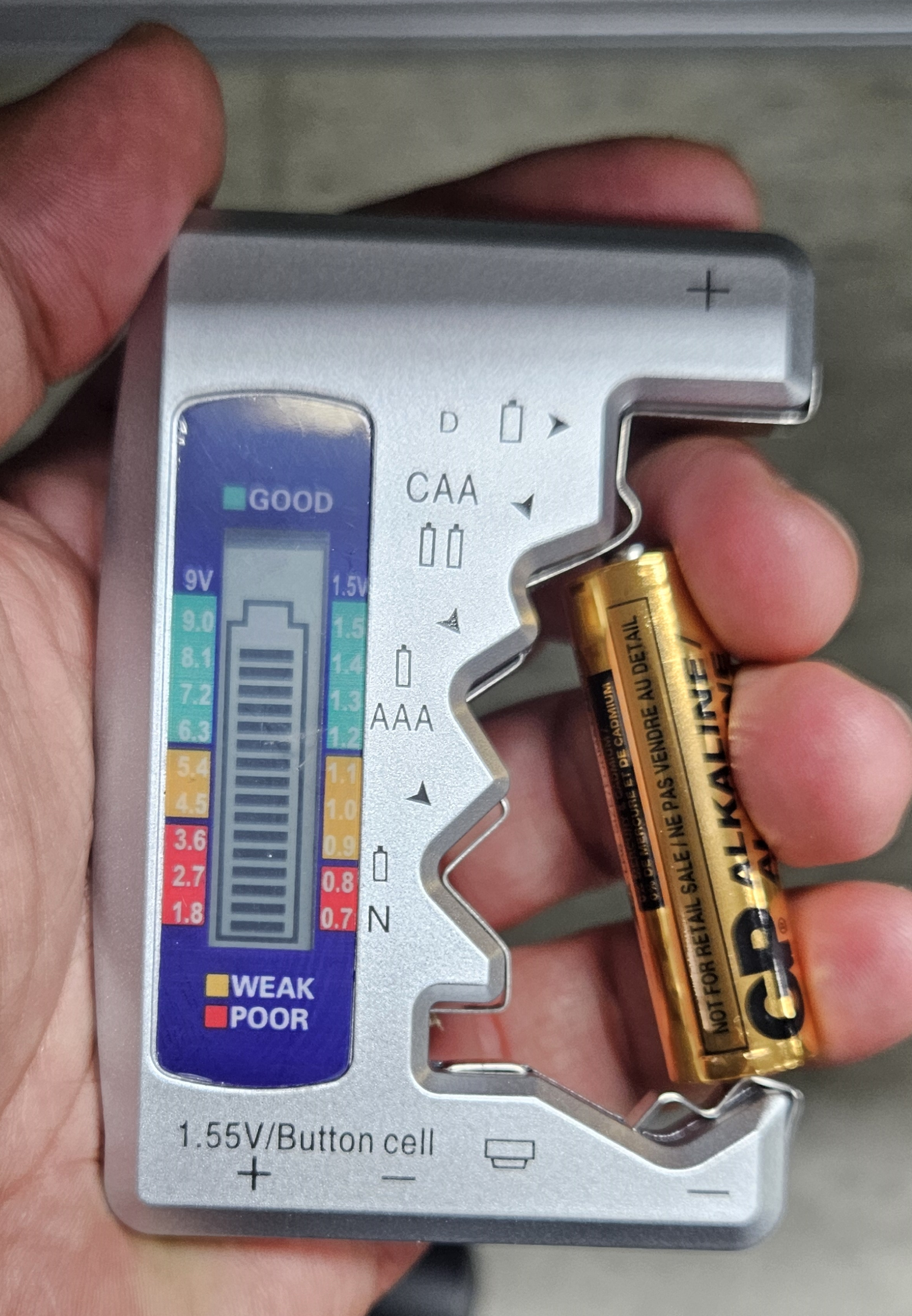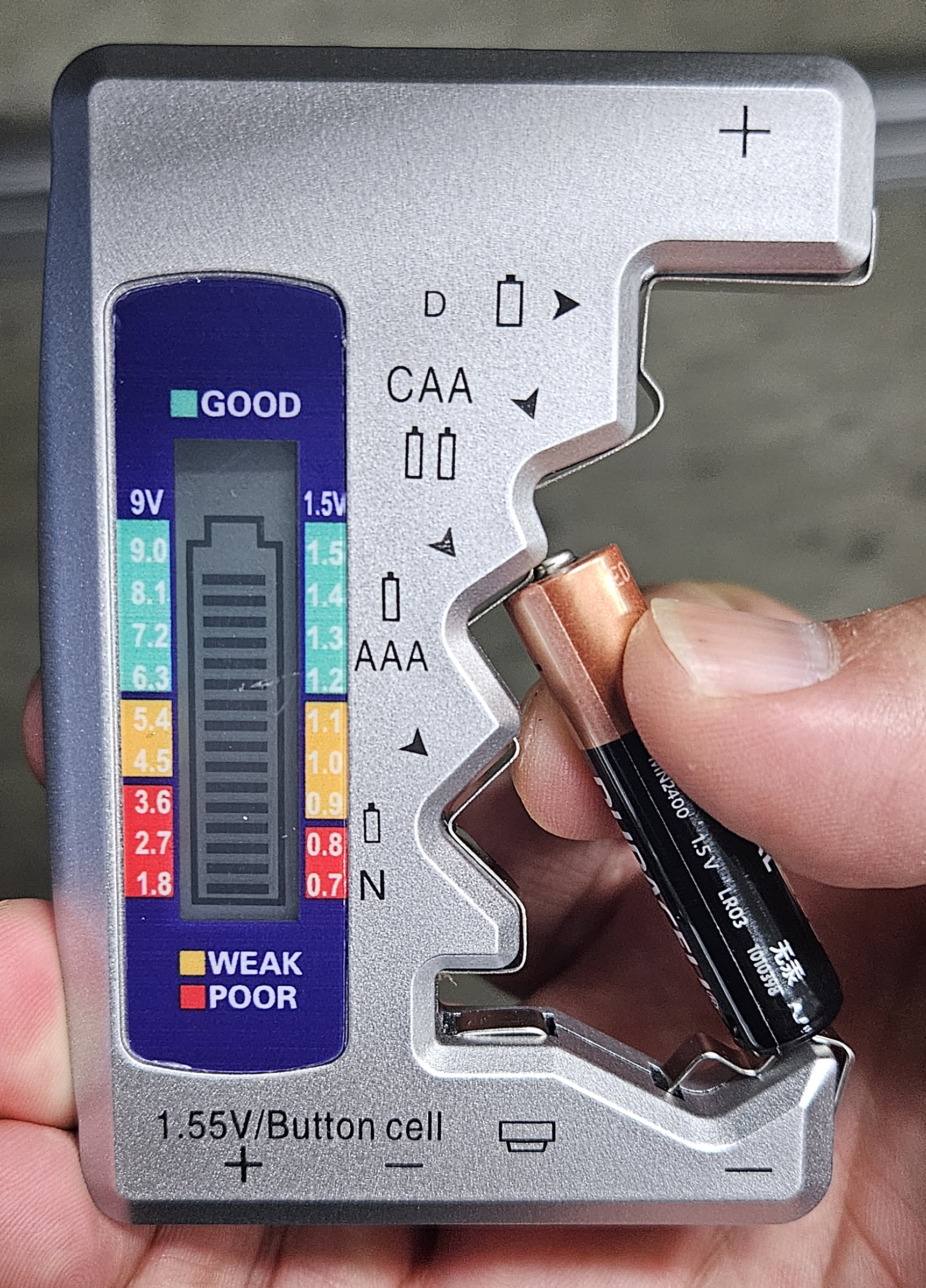 측정 결과는 1.4볼트 조금 위 정도이고, 상태는 녹색이니 Good 상태이다. 그냥 이것만 보면 못 믿어우니까, 테스트 기를 이용해서 확인했다.