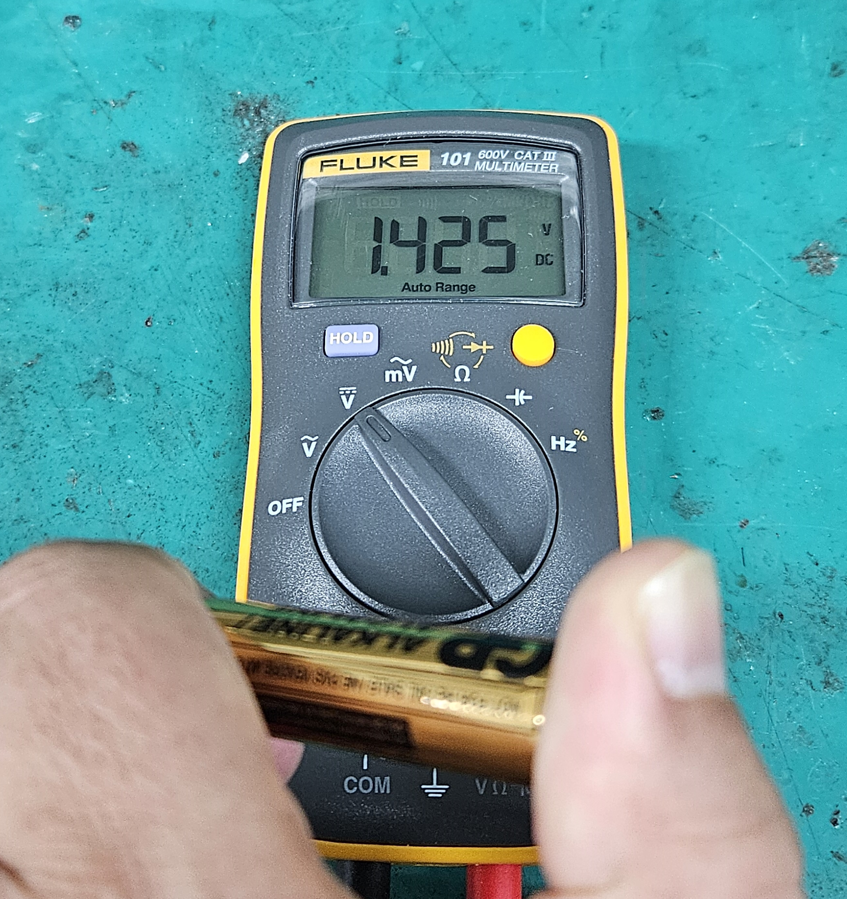 측정 결과는 1.4볼트 조금 위 정도이고, 상태는 녹색이니 Good 상태이다. 그냥 이것만 보면 못 믿어우니까, 테스트 기를 이용해서 확인했다.