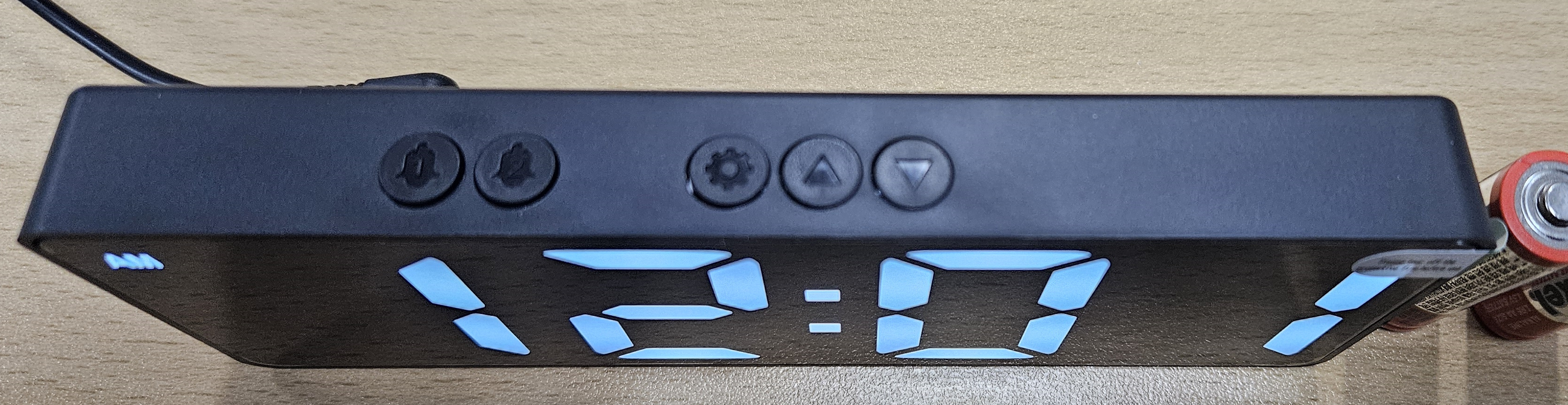 상단부에는 제어를 위한 버튼이 다섯개가 위치하고 있다. 좌측부터 알람 1,2 버튼과 설정버튼, 스크롤버튼 2개로 구성되어있다. 우리가 익히 알고 있지만 설정버튼을 오래 누르면 시간이 깜빡거린다. 그때 스크롤 버튼으로 조정 하면 된다. 한번더 누르면 분표시 부분이 깜빡거리게 되겠지... 그리고 설정이 완료되면 설정버튼을 길게 눌러 설정을 완료하면 된다.