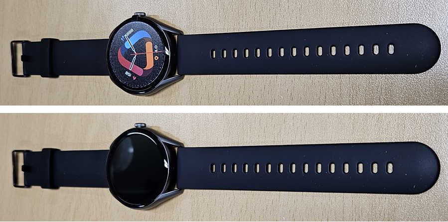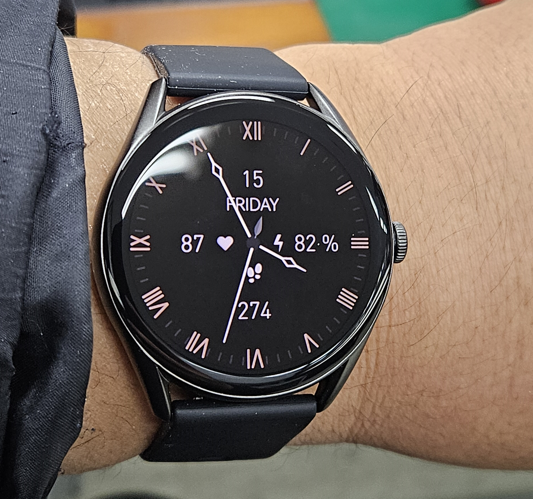 받을당시 충전상태는 70%정도였다. 그래서 버튼을 눌러서 화면을 키고, 다시 눌러서 꺼진 상태와 비교하였다. 예상대로 크기는 갤럭시 액티브2정도 되는듯하고, 초침이 LCD의 끝까지 펼쳐져서 상당히 넓어보였다. 싸보이지가 않았다.