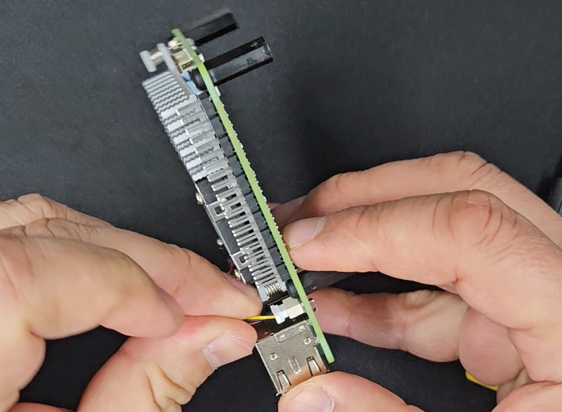 보통 이런 커넥터는 홈이 있던지 해서 굳이 맞춰보지 않아도 되게끔 하는게 좋은데, 너무 작으니 홈도 잘 안보인다. 따라서, 커넥터 핀의 위치를 보고 어느쪽에 가깝게 있는지 확인후, 소켓의 홀의 위치를 보고 연결해주면 되겠다. 필자처럼 손이 굵은 사람은 어느정도 연결후 드라이버 측면을 이용하여 살짝 눌러주면 된다.