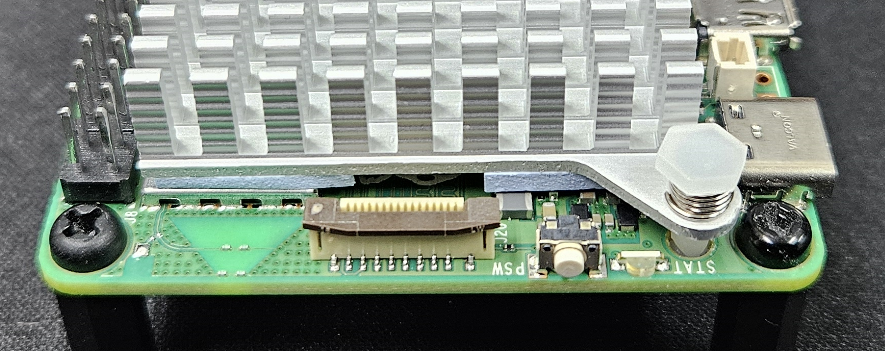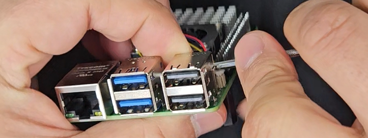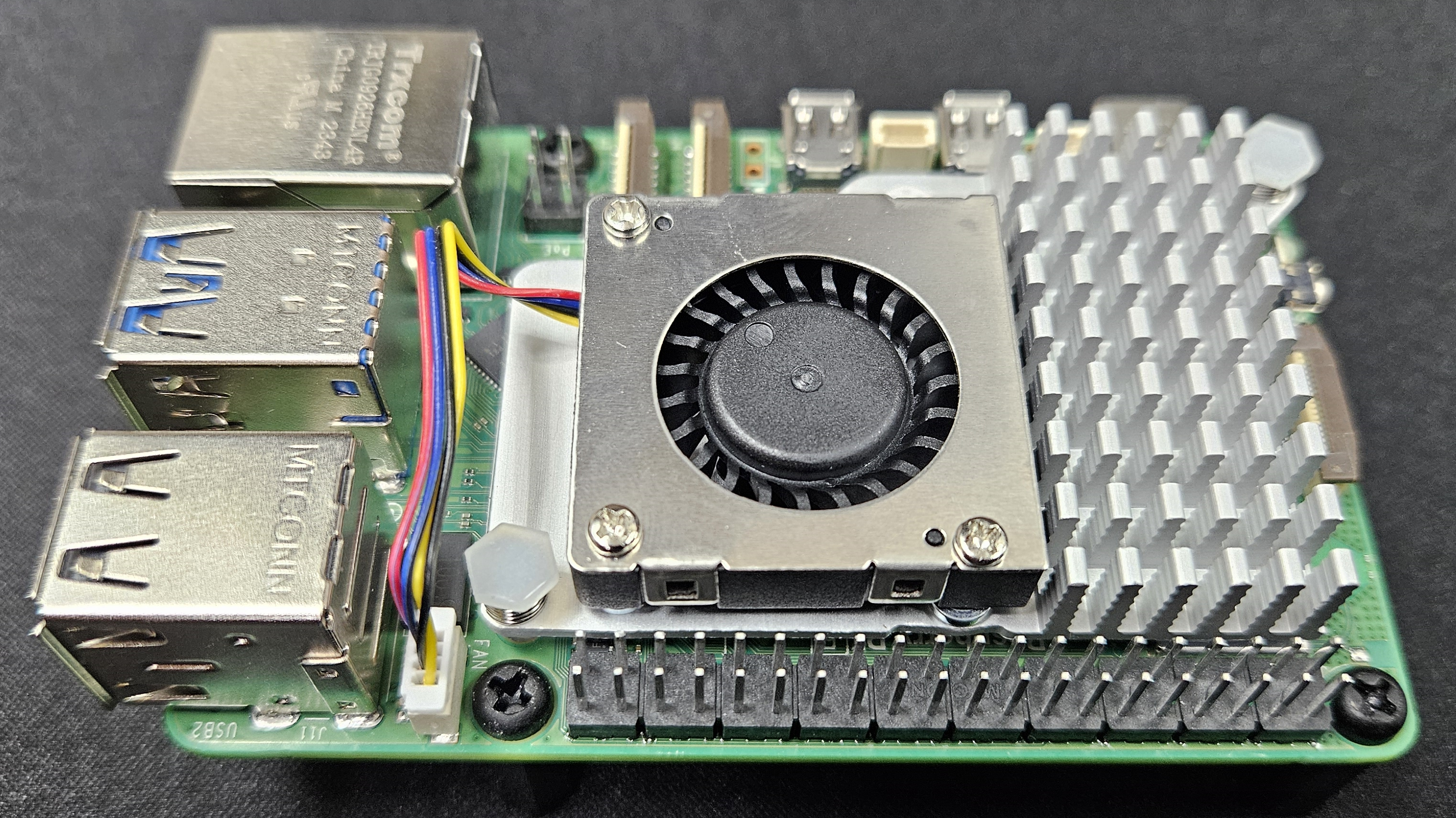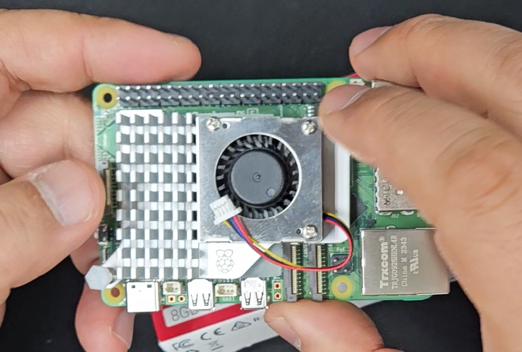 방열판 조립은 박스에 있는 것과 같다. 실제로 뒤집어서 대보면 PCIe 소켓에 데여서 반대로는 꼽히지 않는다. 다만 걱정 되는것은 그럼에도 불구하고 밀어넣는 독자도 있을 것 같은데, 라즈베리파이5 보드의 홀을 확인하고 살짝 대보면 쉽게 확인이 된다. 확인하고 홀에 고정핀을 꽂는것 만으로 장착이 끝나고, FAN 커넥터는 라즈베리파이에 FAN으로 실크(프린팅) 된 소켓에 연결하면된다. 이때, 소켓을 잘 보면 핀이 한쪽으로 몰려있으니 방향 확인한 다음 연결해주면 되겠다.