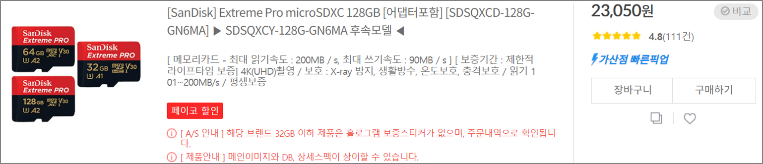 다음은 익스트림이다. 최대 읽기속도200MB/s, 최대 쓰기속도 90MB/s라고 한다. 64기가는 표시되어있지 않지만, 세부 옵션에서 12500원 정도임을 확인할 수 있다.