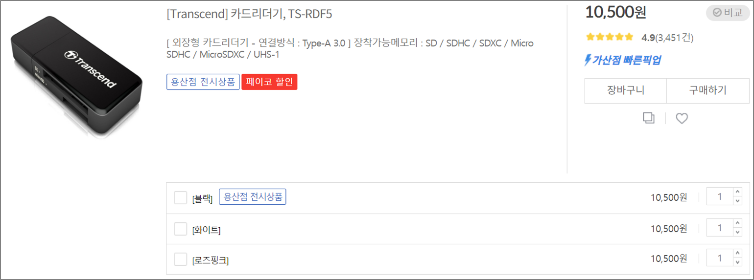 이번 테스트에서는 USB 3.0 기반의 MicroSD 카드리더를 이용하여 측정, 테스트에는 Crystal Diskinfo 와 장시간 신뢰하면서 사용했던 트랜샌드 USB 3.0 카드리더를 사용하였다.