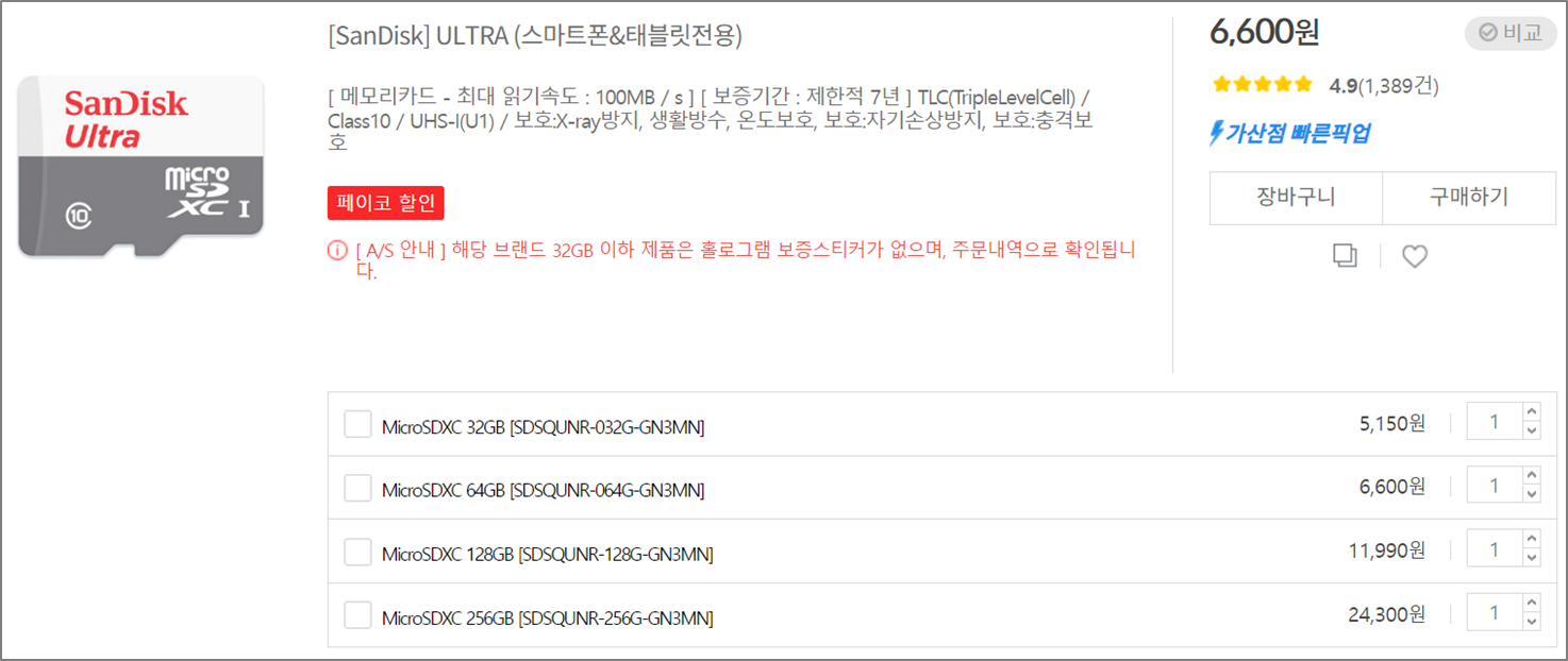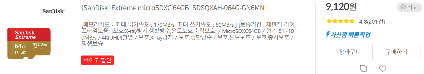 다음은 익스트림이다. 최대 읽기속도200MB/s, 최대 쓰기속도 90MB/s라고 한다. 64기가는 표시되어있지 않지만, 세부 옵션에서 12500원 정도임을 확인할 수 있다.