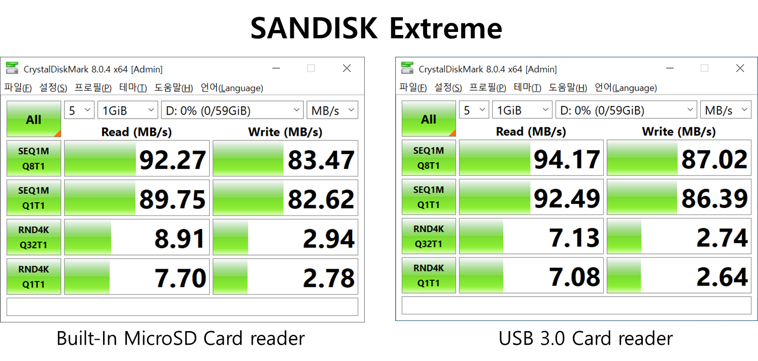 이전 시험 결과와 USB 3.0 카드리더를 사용한 시험결과이다. 크게 의미 없어 보인다.