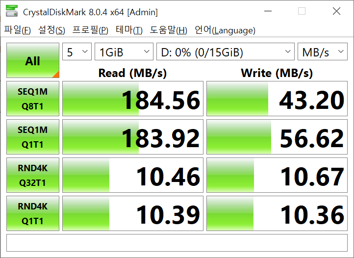 테스트한 메모리는 Sandisk Extreme 16GByte제품이다. 64GB짜리가 안보여서, 16GByte로 시험하였다. USB 메모리나 NVME나 SSD등은 용량 크기에 따라서 읽기 또는 기록속도의 차이가 있을 수 있다. 보통 128이하는 크게 차이가 없으니 참고만 하도록 하자. 184MB/s 정도로 원래 스펙과 비슷하게 나오는데 반해서 기록속도는 많이 떨어짐을 확인할 수 있다.