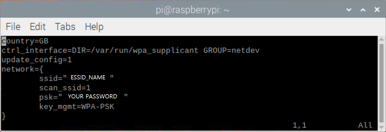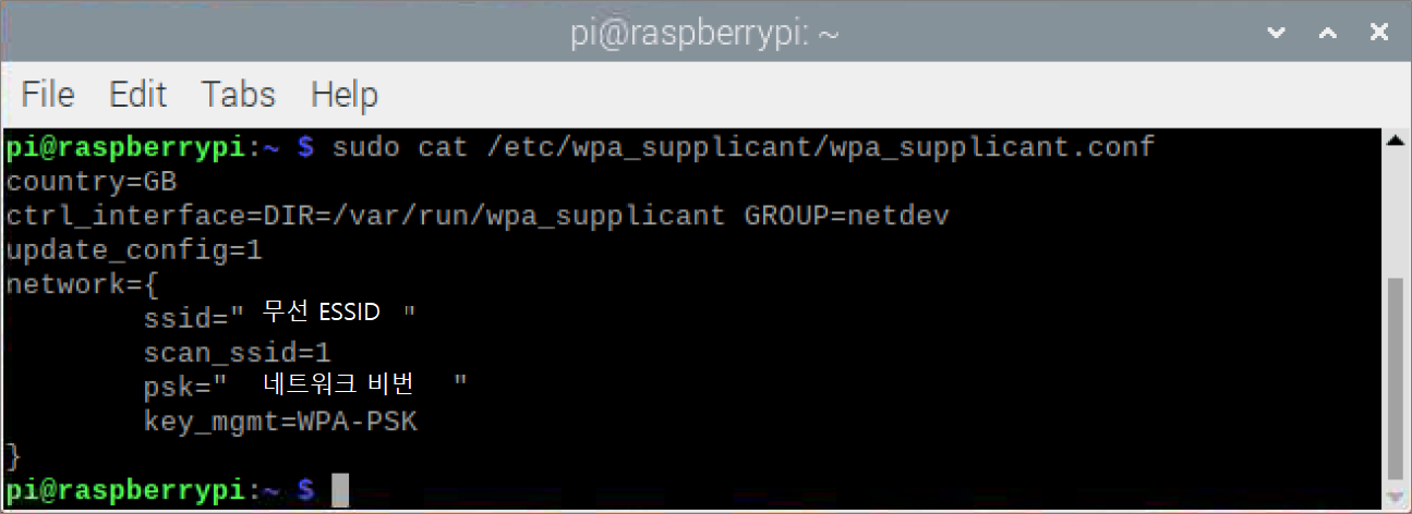 | country=GB ctrl_interface=DIR=/var/run/wpa_supplicant GROUP=netdev update_config=1 network={ ssid="연결할 무선 네트워크의 ESSID" scan_ssid=1 psk="비밀번호" key_mgmt=WPA-PSK } |