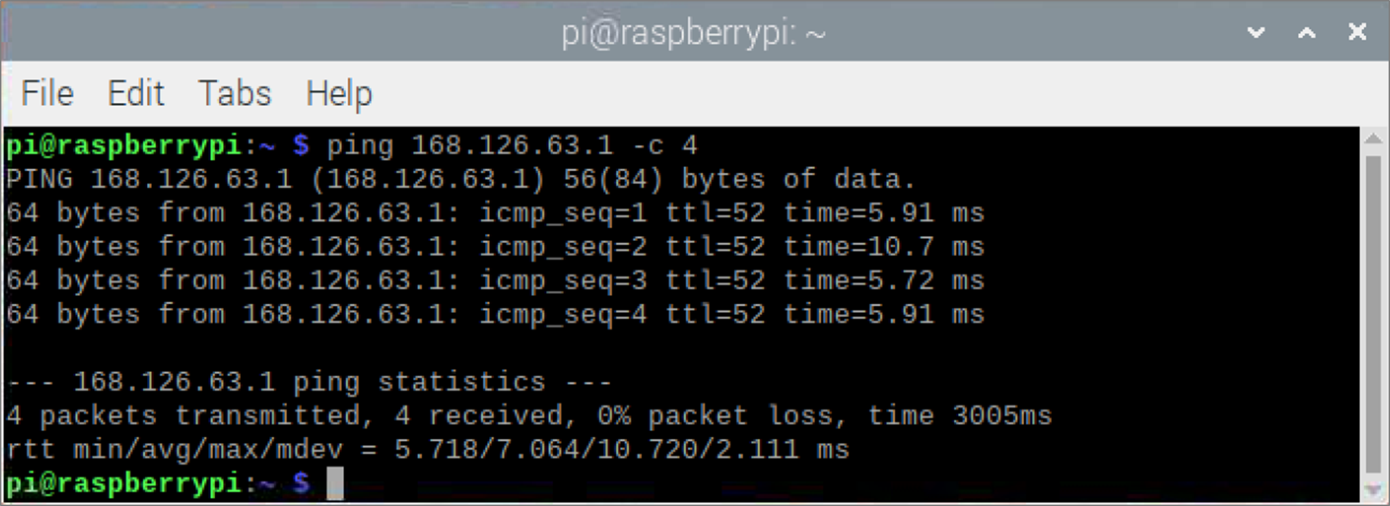 마지막으로 통신 테스트를 진행하자. 대상은 168.126.63.1로 4번만 ping을 날려보기로 하자.