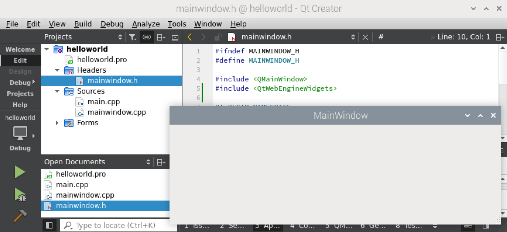소스 에디터에서 웹엔진 헤더를 포함한다. mainwindows.h를 열어 <QtWebEngineWidgets>를 추가한다. 그리고 실행하면 경로 라인이 사라지면서 아래와 같이 실행되는 것을 볼 수 있다. 만약, 웹엔진 라이브러리가 포함되어있지 않으면 오류가 발생되며 다이얼로그가 실행되지 않는다.