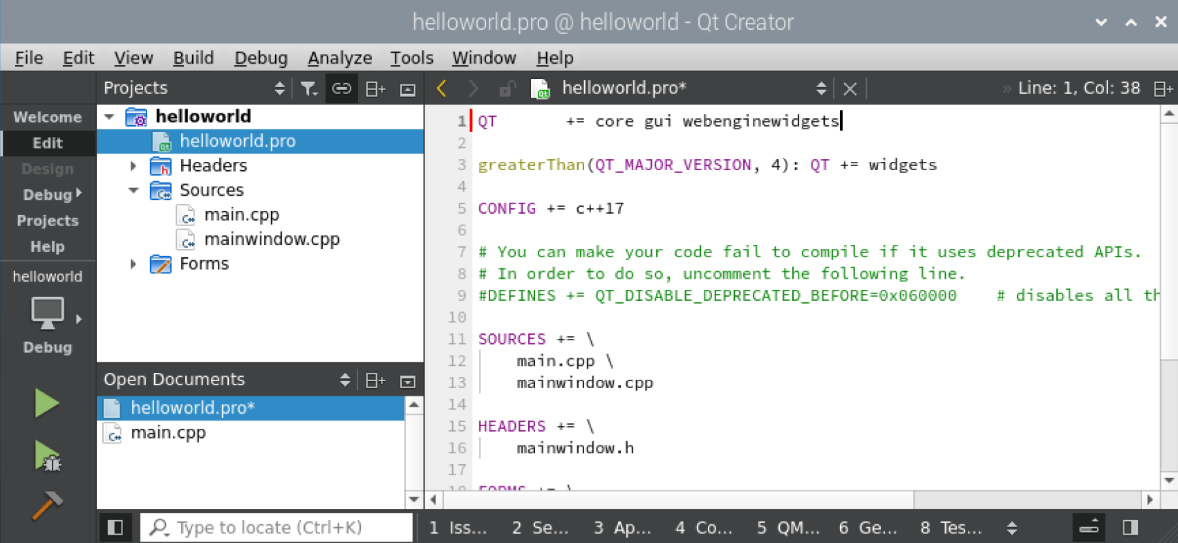 프로젝트 파일을 더블클릭한 다음 gui 옆에 webenginewidgets를 추가한다.