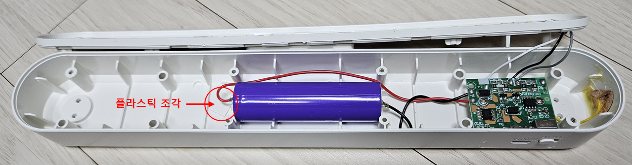 LED와 내측조립 커버는 한번에 빼주면 된다. 납땜부위 반대편 측면 굵은 홀에 비금속 좍대기를 넣어서 살살 들면 빠진다. 그 결과 어디서 나온 플라스틱인지 모르겠지만 하나가 굴러다니고 있다.