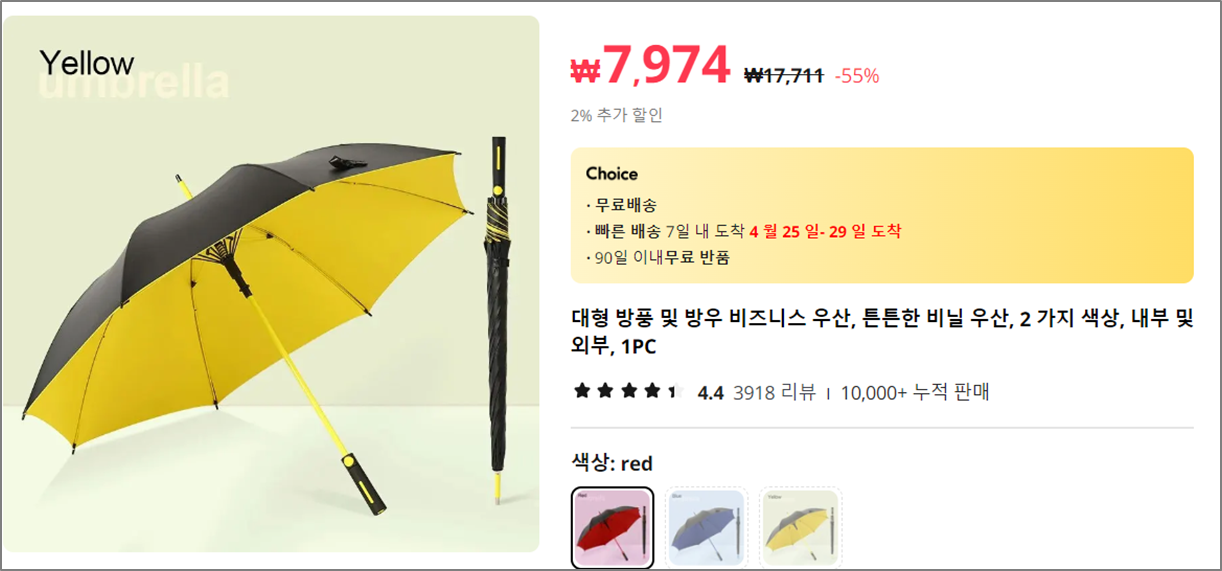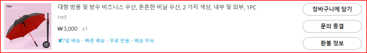 본 게시물은 알리의 폐혜를 이야기 하는것이 아니다. 최종적으로 필자가 본 게시물에서 이야기 하고 싶은 내용은, 우산을 시킬때는 여러개를 우산만 시켜야 한다는 이야기를 하고 싶다. 알리는 최소 개수는 채워야 할인이 되니까 말이다.