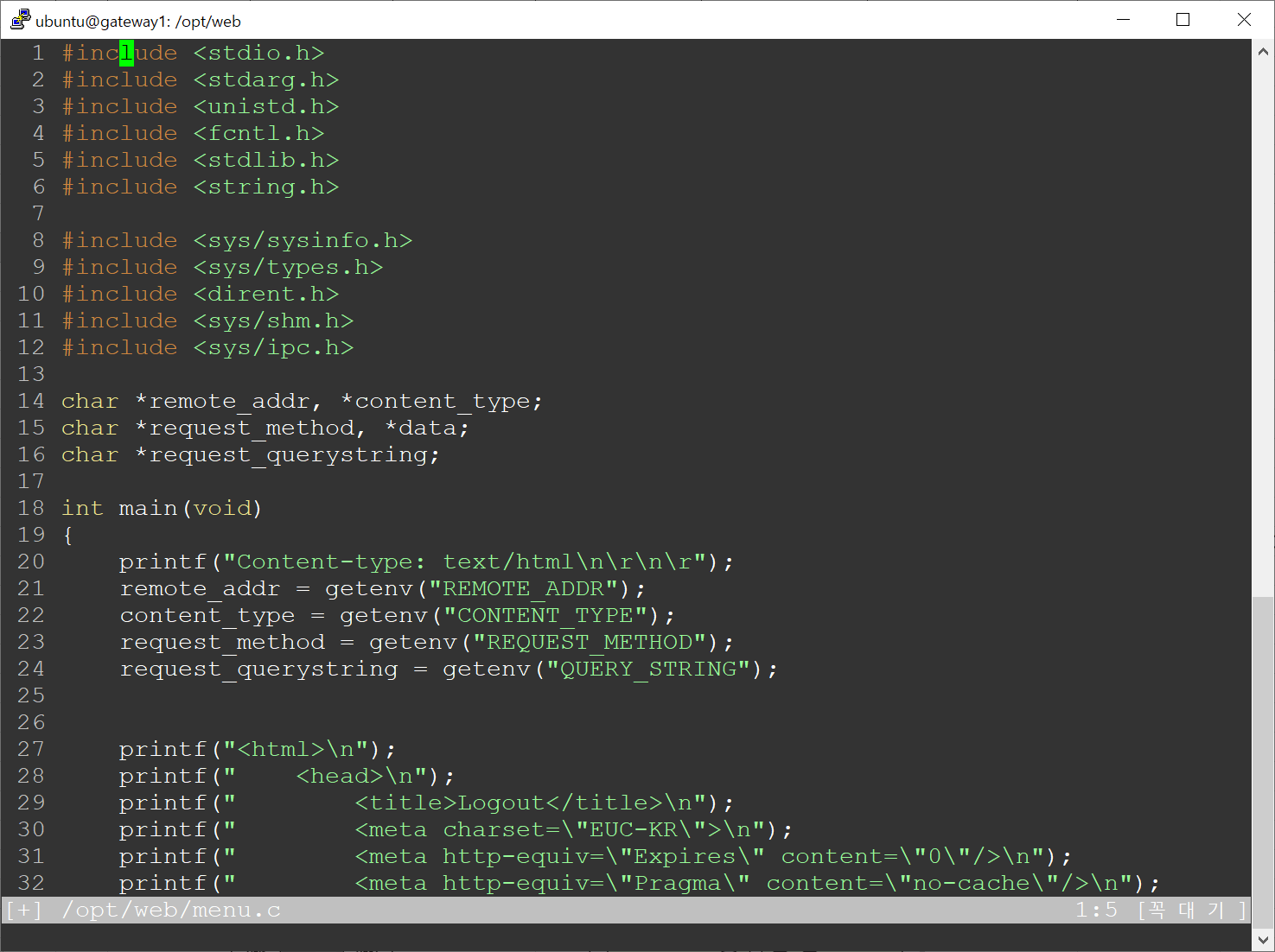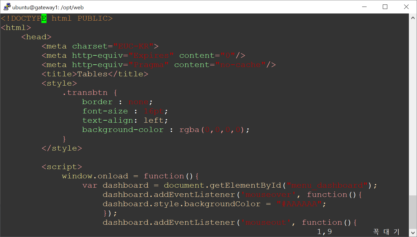 이전의 설정일 때, vim에디터로 html 파일을 열면 다음과 같이 특정 색이 적색으로 표시된다. 잘 안보인다. 그러면 이제 vim을 이용하여 필자가 가볍게 사용하는 기본 설정을 적용해서 어떻게 바뀌는지 확인해보자. 젊었을 땐 잘보였었나?