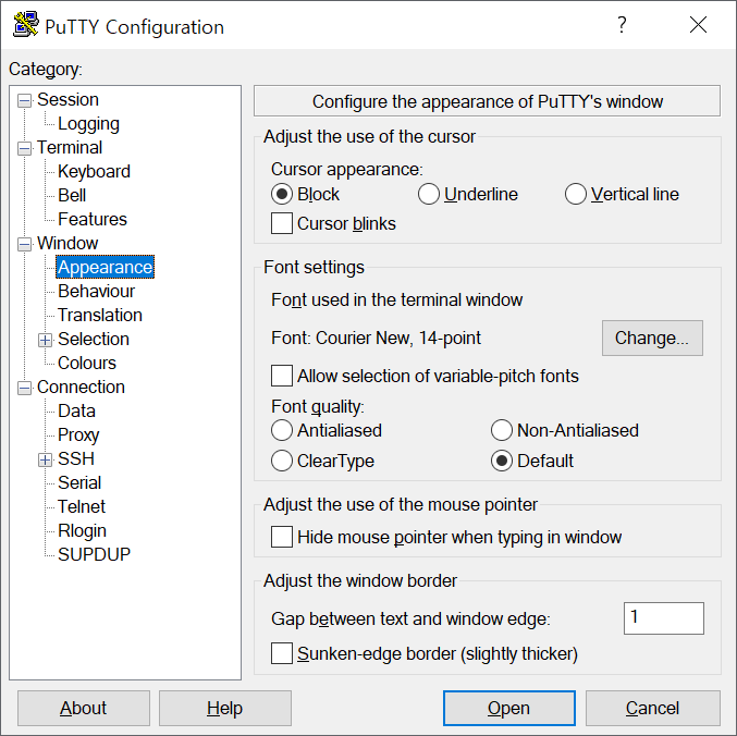 아래는 Putty Confiuration 화면이다. 주로 수정할 부분은 Apperance와 Colours 항목이 되겠다. 연결한 ip를 적고 세션이름을 적고 Save를 눌러야 저장이 된다는점 주의한다. 추가 수정시에도 저장된 세션을 부르고 설정을 변경후 다시 저장해 주어야 한다. 항상 저장하지 않고 Open을 누르는 버릇때문에 몇분동안 설정해 놓은 걸 한번만 쓰고 날리는 경우가 종종 있으므로 수정 후에는 항상 저장버튼을 눌러주자.