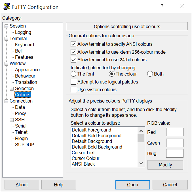 : Windows > Colours > Adjust the percise colours PUTTY displays > Select a colour to adjust 항목