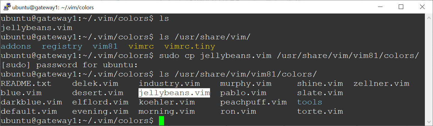 $ sudo cp jellybeans.vim /usr/share/vim/vim81/colors/