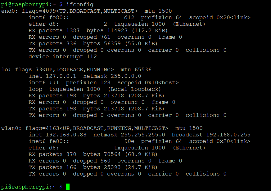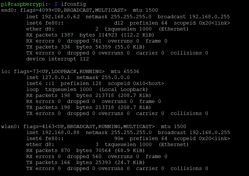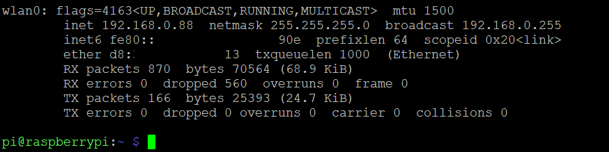 어쨋든 내가 사용하는 네트워크에 연결되도록 만든 다음 ip를 확인해 주도록 하자. 유선을 사용하는 경우 eth0, 무선을 사용하는 경우라면 wlan0를 확인하면 된다. 필자의 경우 무선으로 연결하였고, ip는 192.168.0.88설정 하였기에 아래와 같이 wlan0가 지정한 ip로 설정된 것을 확인할 수 있다.