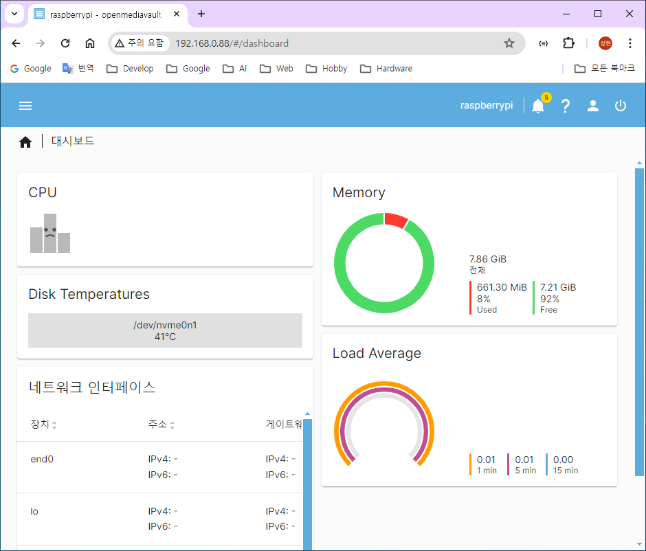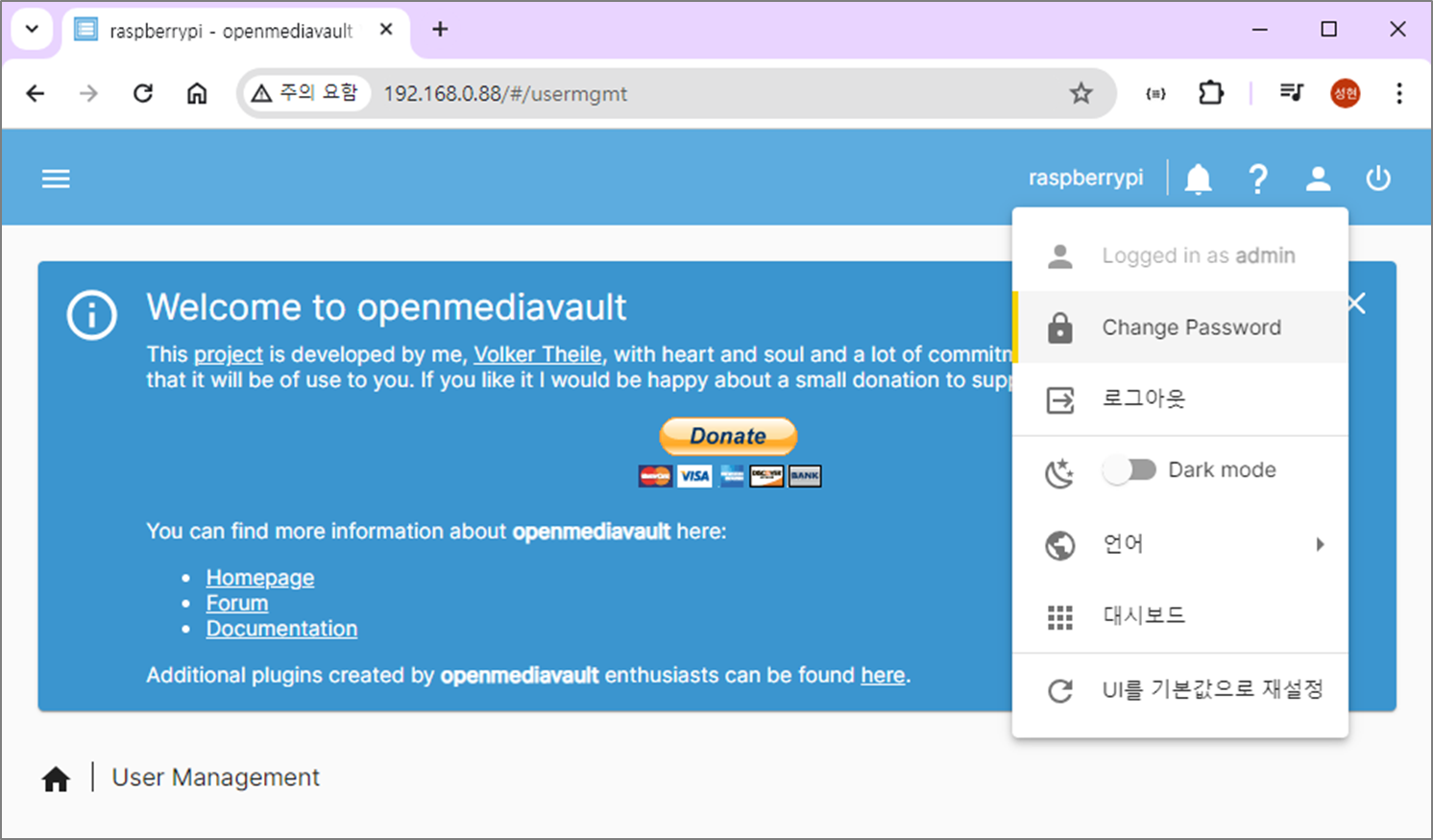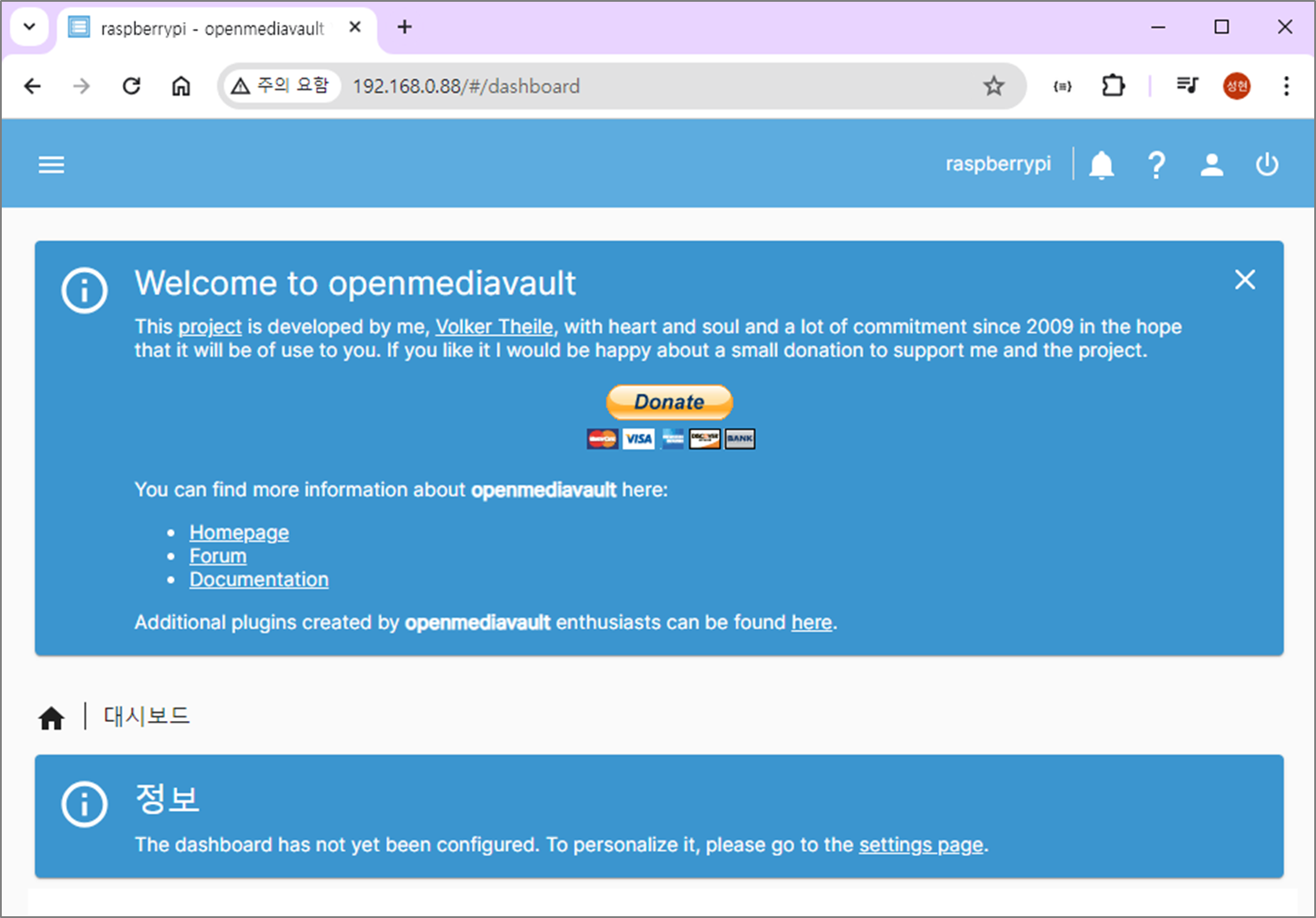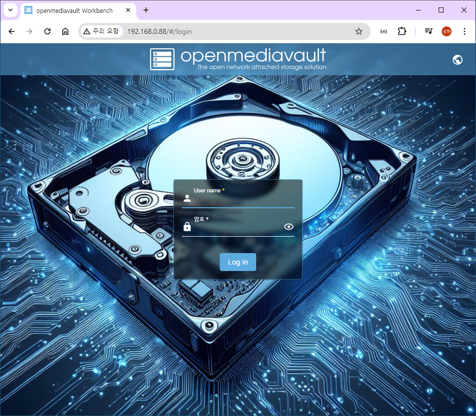 설치가 무리없이 완료되었다면, 이제 OpenMediaValut를 설정해 주도록 하자. 동일한 네트워크에 있는 PC에서 웹브라우저를 실행하여 라즈베리파의 ip를 이용하여 OpenMedaiVault에 접근할 수 있다.