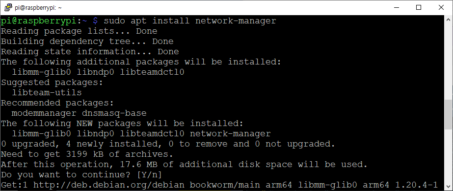 Xwindow에서 네트워크를 설정한경우, Xserver가 지워졌으므로, ip할당등이 되지 않는 문제가 발생된다. 재부팅 해보면, 부팅시 systend-networkd-wait-online.service에서 오류가 발생되어 부팅이 지연됨을 확인할 수 있다. 따라서 오류의 원인을 해결하기 위해서 아래와 같이 network-manager를 설치한다. wlan을 이용하여 설정하고 있던 필자는, 유선 이더넷을 연결하여 인터넷에 연결하도록 한 다음 진행하였다.