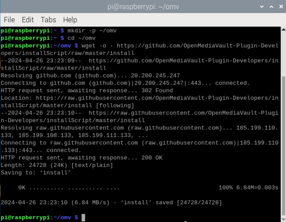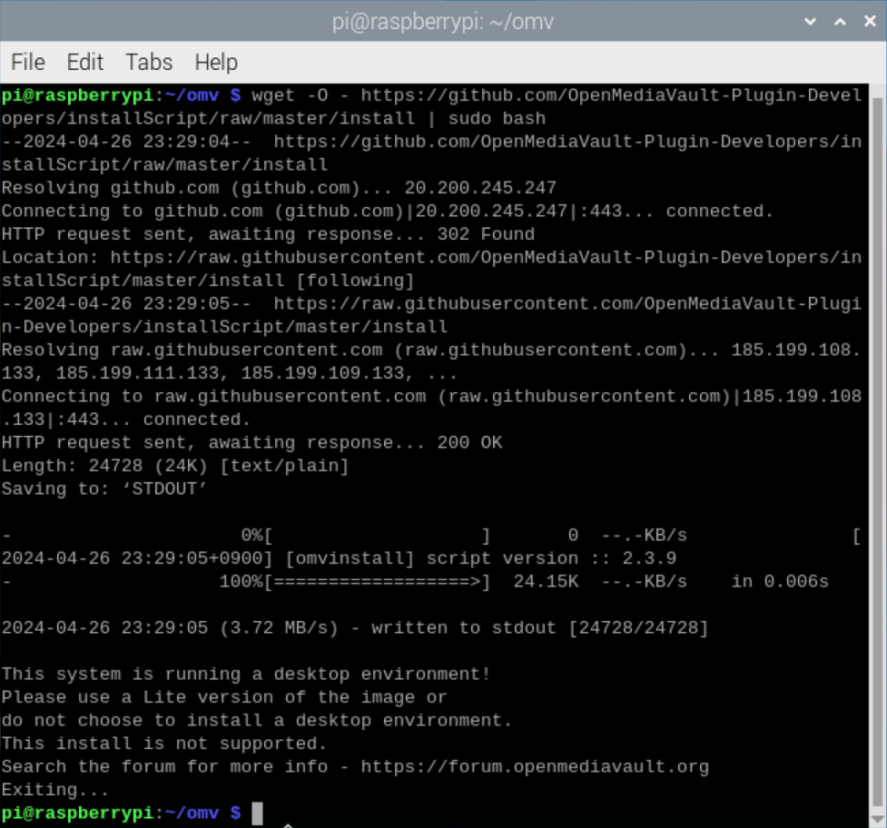 $ wget -o - https://github.com/OpenMediaVault-Plugin-Developers/installScript/raw/master/install