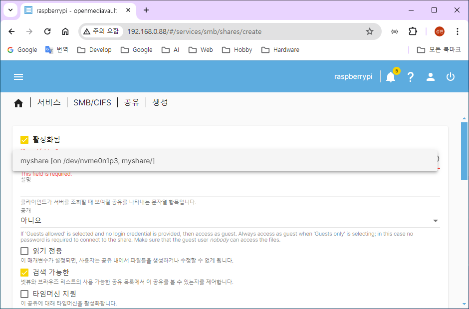 생성을 클릭하고 공유폴더를 선택한다. 그리고 추가적으로 해당 공유 폴더의 옵션을 지정한다. 예를들면, 게스트로 누구든지 사용할 수 있게 한다던지 아니면, 읽기만 가능하게 한다던지 말이다.