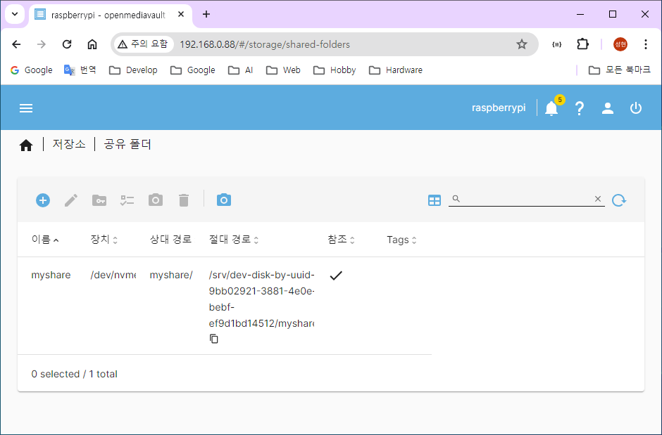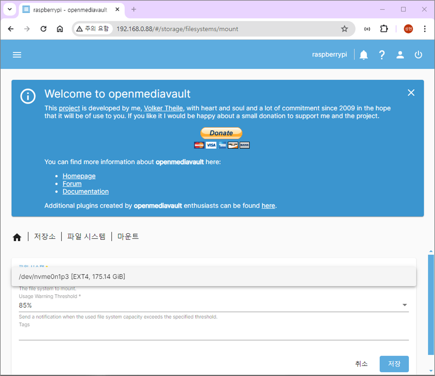 저장소는 외부 장치와 현재 라즈베리파이가 설치되어있는 NVMe를 이용할 수 있다. 왼쪽 메뉴 항목에서 다음의 항목으로 진행한다. 하드 디스크가 1개 이므로 저장소를 설정할 수가 없다.