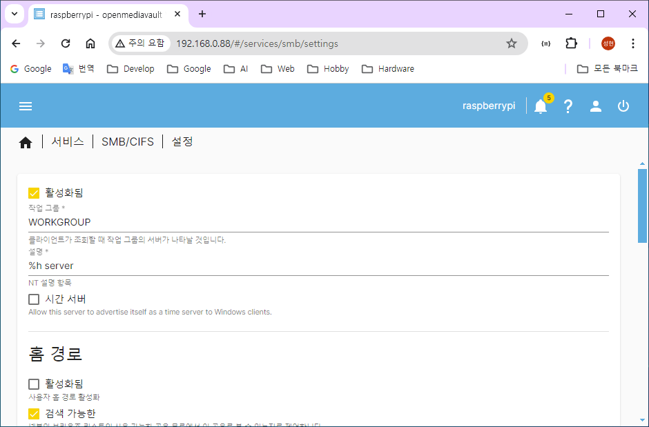 : 메뉴 > 서비스 > SMB/CIFS > 설정
