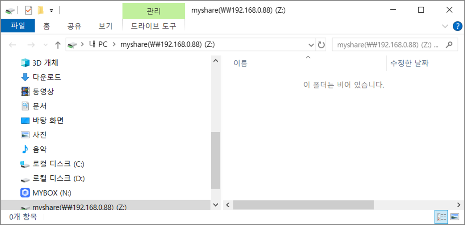 공유폴더의 설정이 완료되었으므로, 이제 다른 PC에서 접속이 가능해졌다.