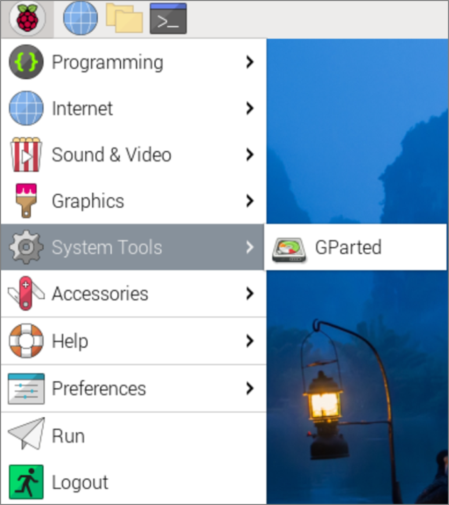 : Pi-Apps > System Management > GParted 클릭 > 설치