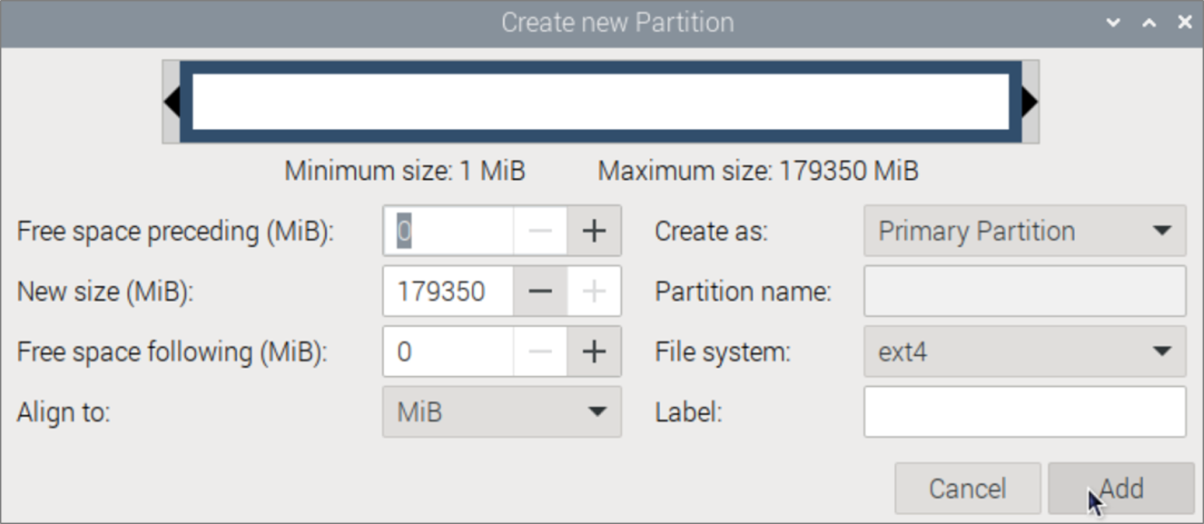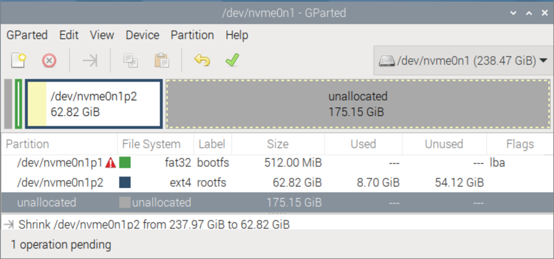 그럴려면 위의 파티션 정보에서 ext4 root 파티션인 nvme0np2를 선택하고 크기를 237기가에서 64기가로 변경한다.