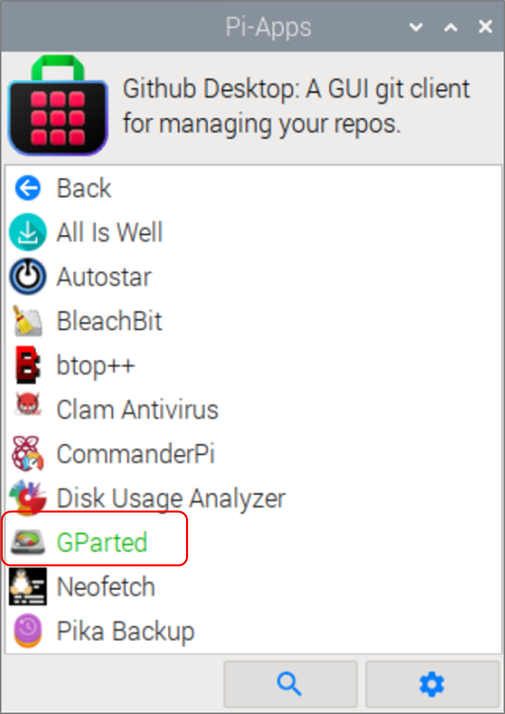 pi-apps를 실행해서 gparted를 선택하여 설치한다.