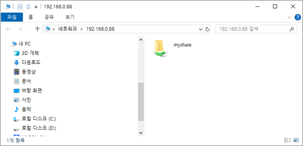 표시되는 네트워크의 폴더에서 192.168.0.88 항목을 클릭하여 공유가능한 폴더를 선택한다.
