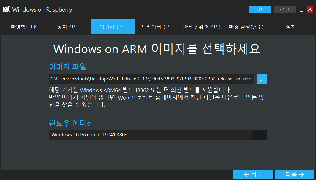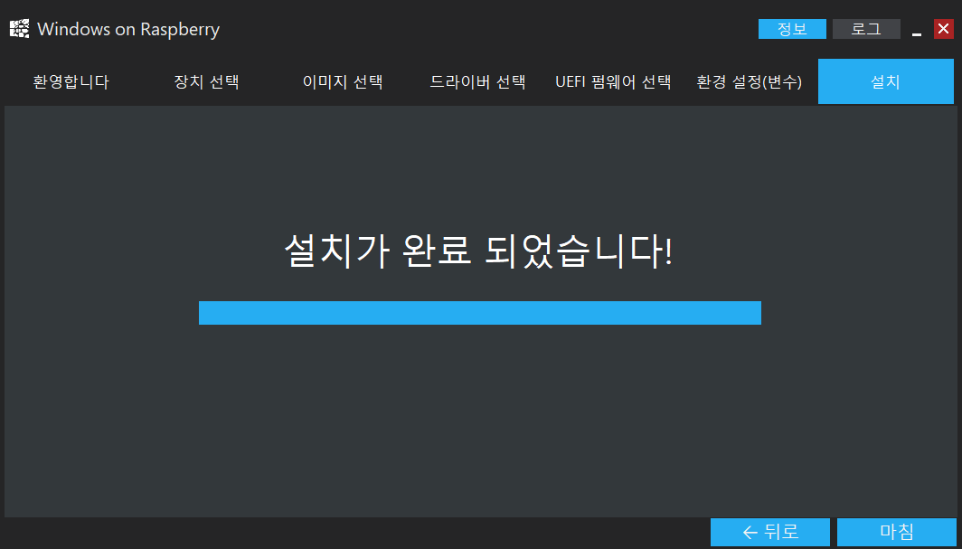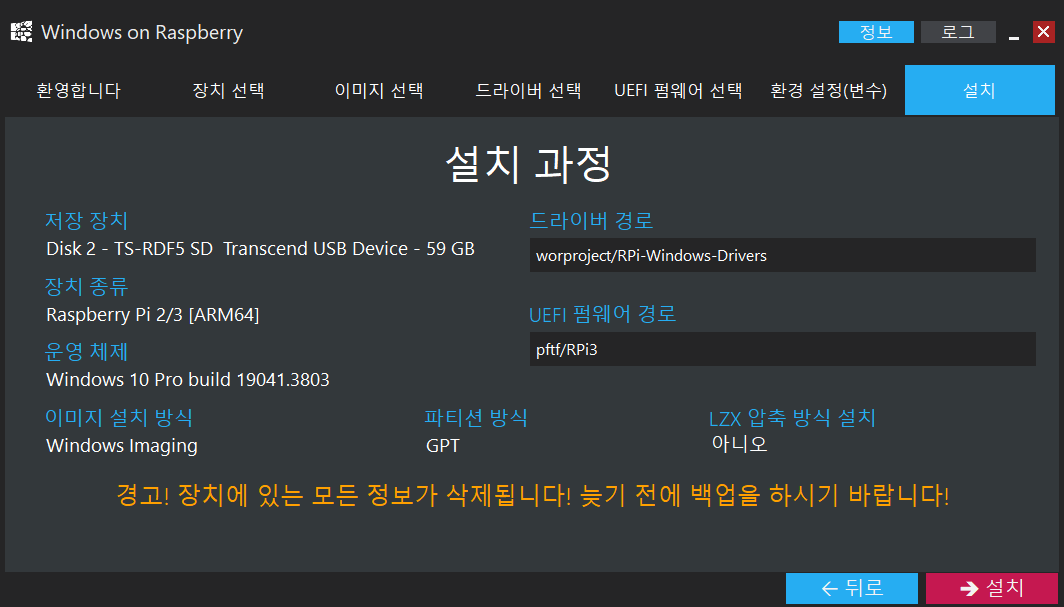 3) Windows on Raspberry (WoR)에서 이미지 기록 설정을 마무리한다.