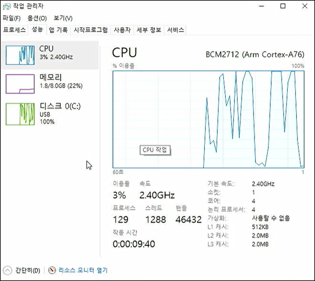 라즈베리파이가 4코어니까.. 코어 상태가 정상적으로 표시되는지 확인해보자. 대충 작업관리자에서 확인해보니, 코어 4개가 있음을 알수있다. 그리고 기타 내용까지.. 필자가 이미지를 만들때 16GByte USB메모리를 썼더니, 디스크가 꽉 찾다. 꼬끼오톡이라도 설치해서 사용하려면 최소한 32GByte를 이용하고, 오피스도 설치하려면 가능하면 128GByte이상을 사용할 것을 권장한다.