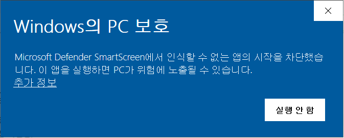 아무래도 윈도우 이미지를 쓰는거고, 디바이스를 직접 제어하는 프로그램이기 때문에 SmartScreen에서 경고 메시지를 표시한다. 추가정보를 클릭하고, 실행 버튼을 클릭한다.