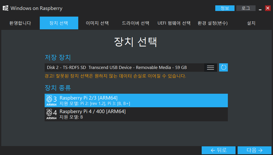 - 저장장치 : USB 메모리를 목록에서 선택 / Raspberry Pi2/3 (4선택시 부팅안됨)