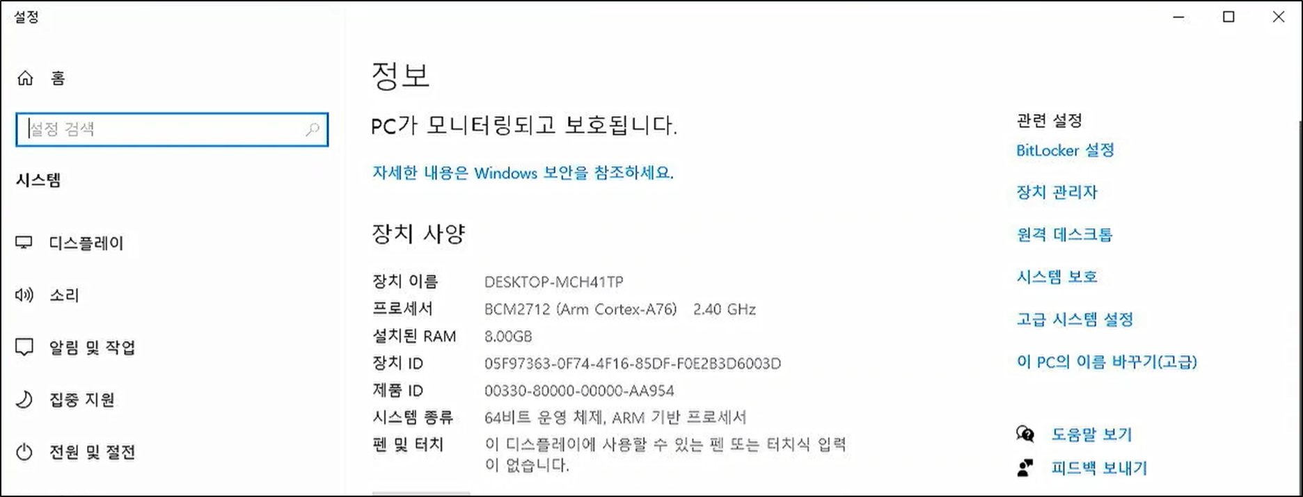 장치관리자의 속성에서 확인할 수 있다. 자세히 보면 BCM2712 (Arm Cortex-A76) 2.4Ghz라고 표시되고, 메모리 8GByte가 설정되어있음을 알수 있다.