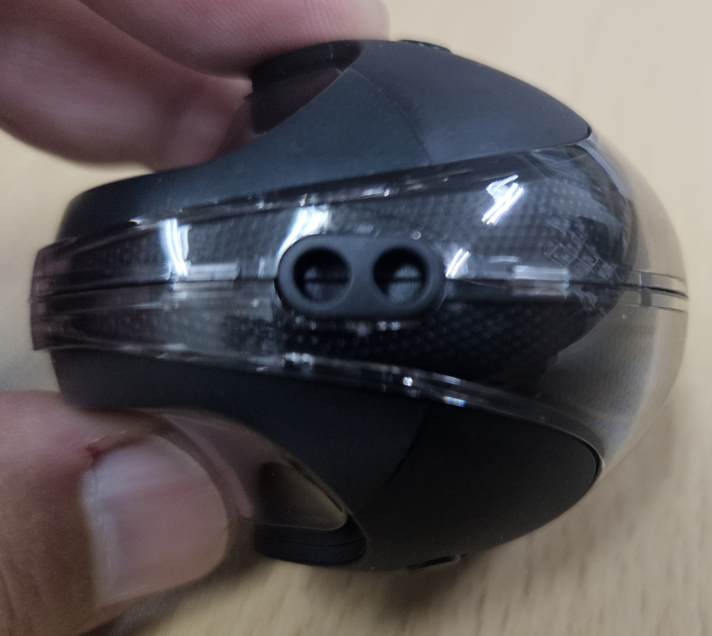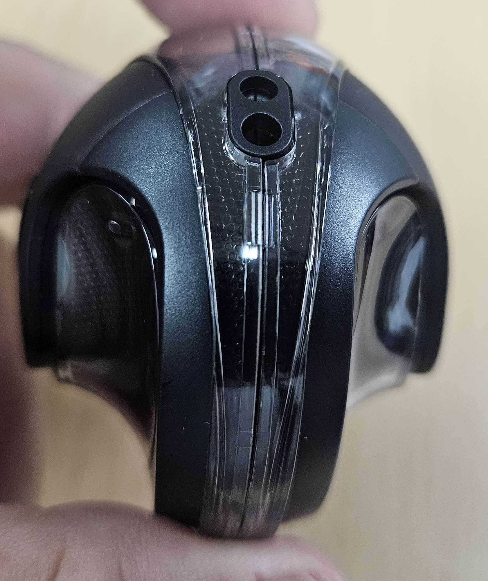 목줄 홀 쪽이 윗면이라 할때 정면 모습은 아래와 같다. 좌우측 검은색 부분이 이어폰 리시버 되시겠다.