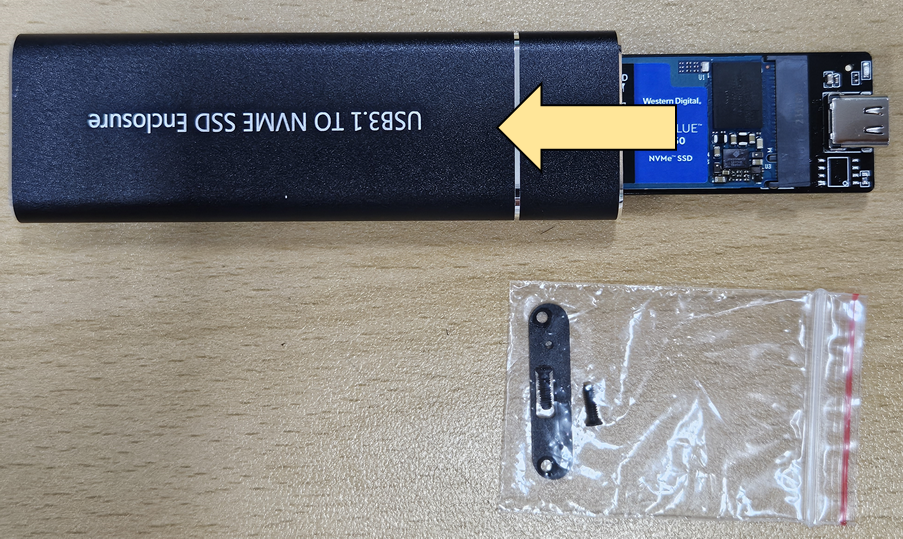 하드케이스에 보면 홈이 파져있어서 보드가 일정한 방향으로 들어가도록 되어있다. 보드에 M.2 SSD를 장착하고, 케이스에 화살표 방향으로 밀어넣어주기만 하면된다.