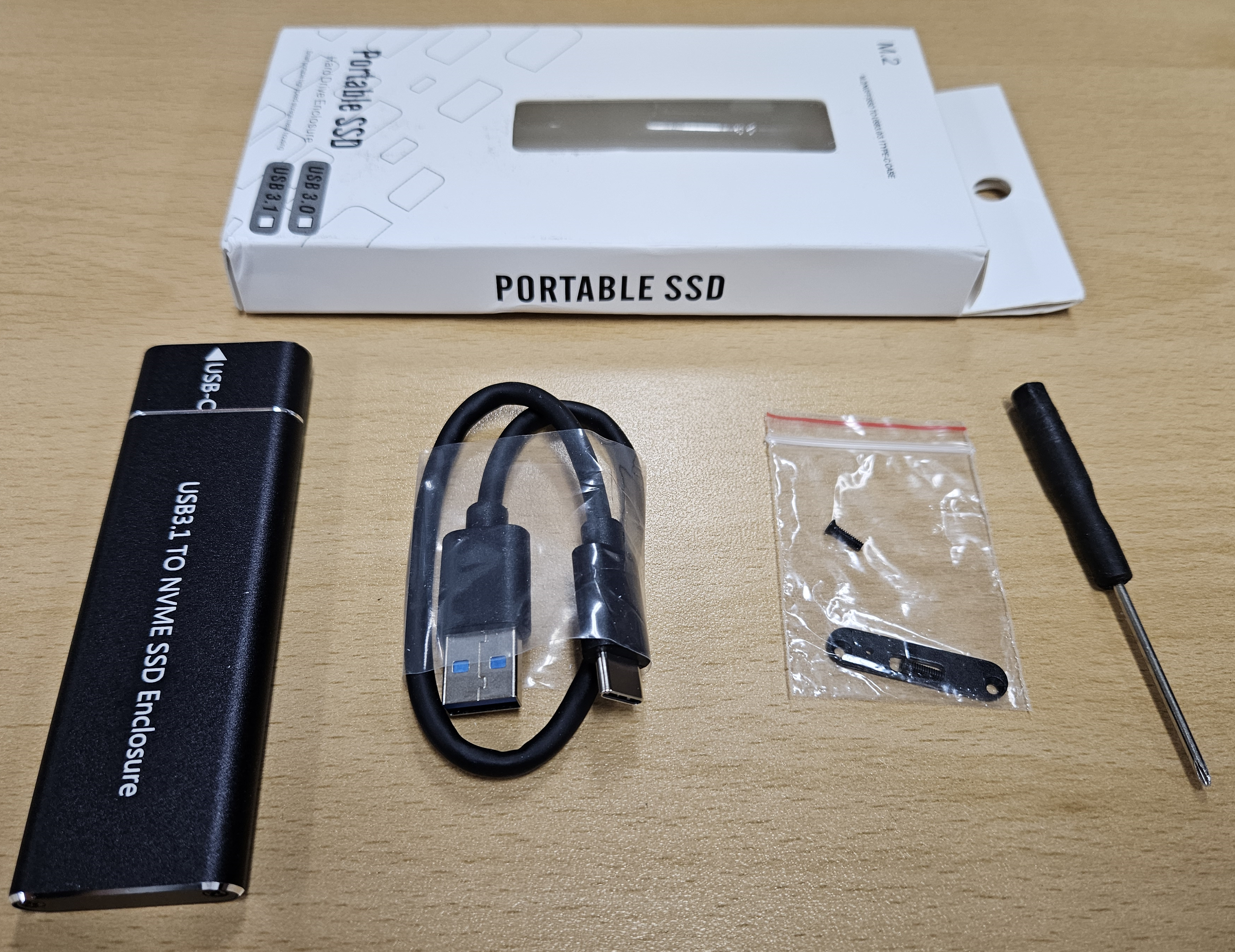 하드케이스와 케이블, 그리고 전면이 뚤려있는 구조다 M.2 SSD를 넣고, 봉지에 있는 커버로 나사 2개를 이용하여 막아줘야 되는 구조다. 그래서 드라이버도 준다.