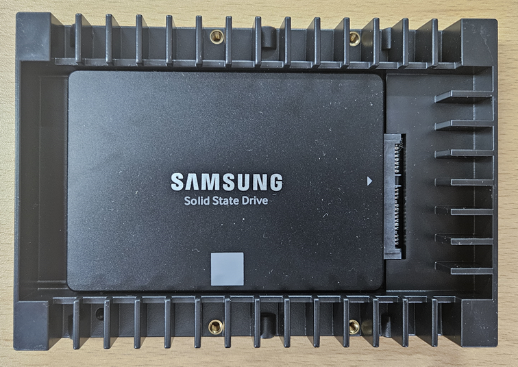2.5" SSD를 홈에 넣고 앞으로 밀면 이렇게 장착이 된다. 고정이 필요하면 동봉된 나사를 이용해서 고정하면되고, 필자의 경우 하드랙에 넣어서 사용할 것이므로 굳이 고정하진 않고 쓸 예정이다.
