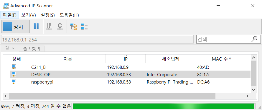 설정(sudo raspi-config)에서 ssh등이나 필요한 것들 선택해주고, vim 같은 에디터나 원격지에서 notepad, vsc를 사용하기 바란다. 필자는 옛날 사람이므로, ssh를 이용해서 진행할 한다. 만약 ssh로 작업을 하는 사용자라면, 설치후 라즈베리파이에서 ifconfig 명령을 이용해서 무선랜의 ip를 이용하여 접속하거나, advanced ip scanner를 사용하여 라즈베리파이의 ip를 확인하면 되겠다.
