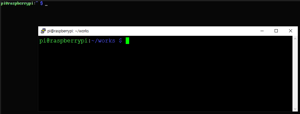실행결과는 다음과 같다. 앞서 설명한것 같은데, 뒷쪽 화면은 라즈베리파이에 연결된 모니터 화면이고, 앞의 터미널 화면은 ssh화면이다. 필자의 작업디렉터리는 ~/works (/home/pi/works)이다.